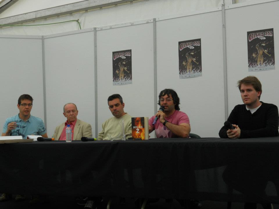 Además, se celebró la presentación de la ‘Antología Z volumen cinco’, con la presencia de su coordinador (Jorge Iván Argiz) y de los autores Ian Watson, Víctor Conde y Javier Ruescas, que hablaron de sus tres relatos incluidos en el mencionado volumen (en la foto, a la izquierda, Diego García, el aplaudido traductor del evento).