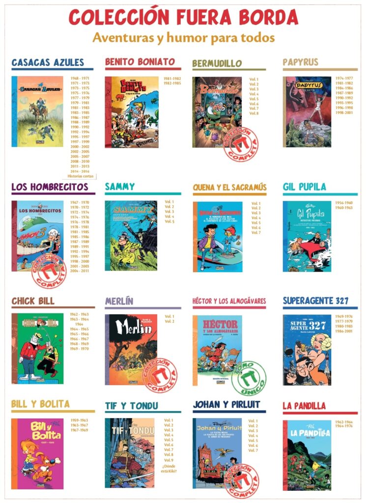 La Colección Fuera Borda reúne algunas de las series más emblemáticas del cómic europeo clásico, ofreciendo aventuras y humor para todas las edades. Una línea editorial que rescata auténticas joyas del tebeo franco-belga, publicadas con esmero en volúmenes integrales y con materiales restaurados.