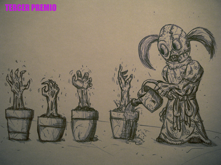 Javier Cort, de Palma de Mallorca. Con su dibujo Sin título. Una idea muy original y gamberra. Hacer crecer a los zombis como si fueran plantas nos ha provocado más de una carcajada.