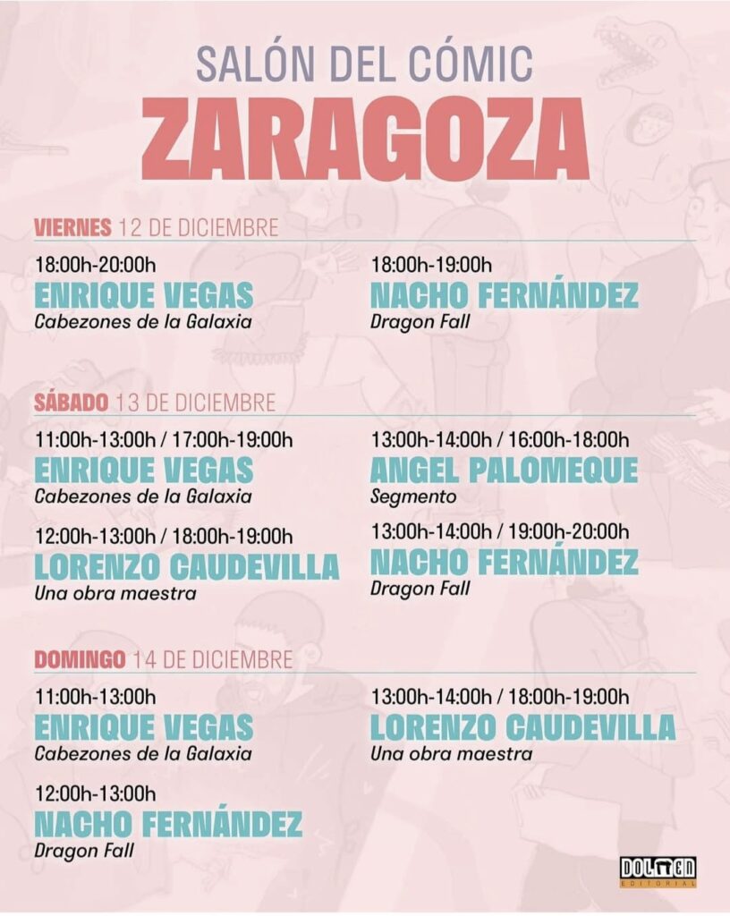 Un año más nos complace anunciar que Dolmen Editorial tendrá presencia en el Salón del Cómic de Zaragoza, que tendrá lugar los días 12, 13 y 14 de diciembre. Si podéis acudir conoceréis a Enrique Vegas, Nacho Fernández, Lorenzo Caudevilla y Ángel Palomeque. Además, podréis disfrutar de otros autores y de diversos talleres y actividades.