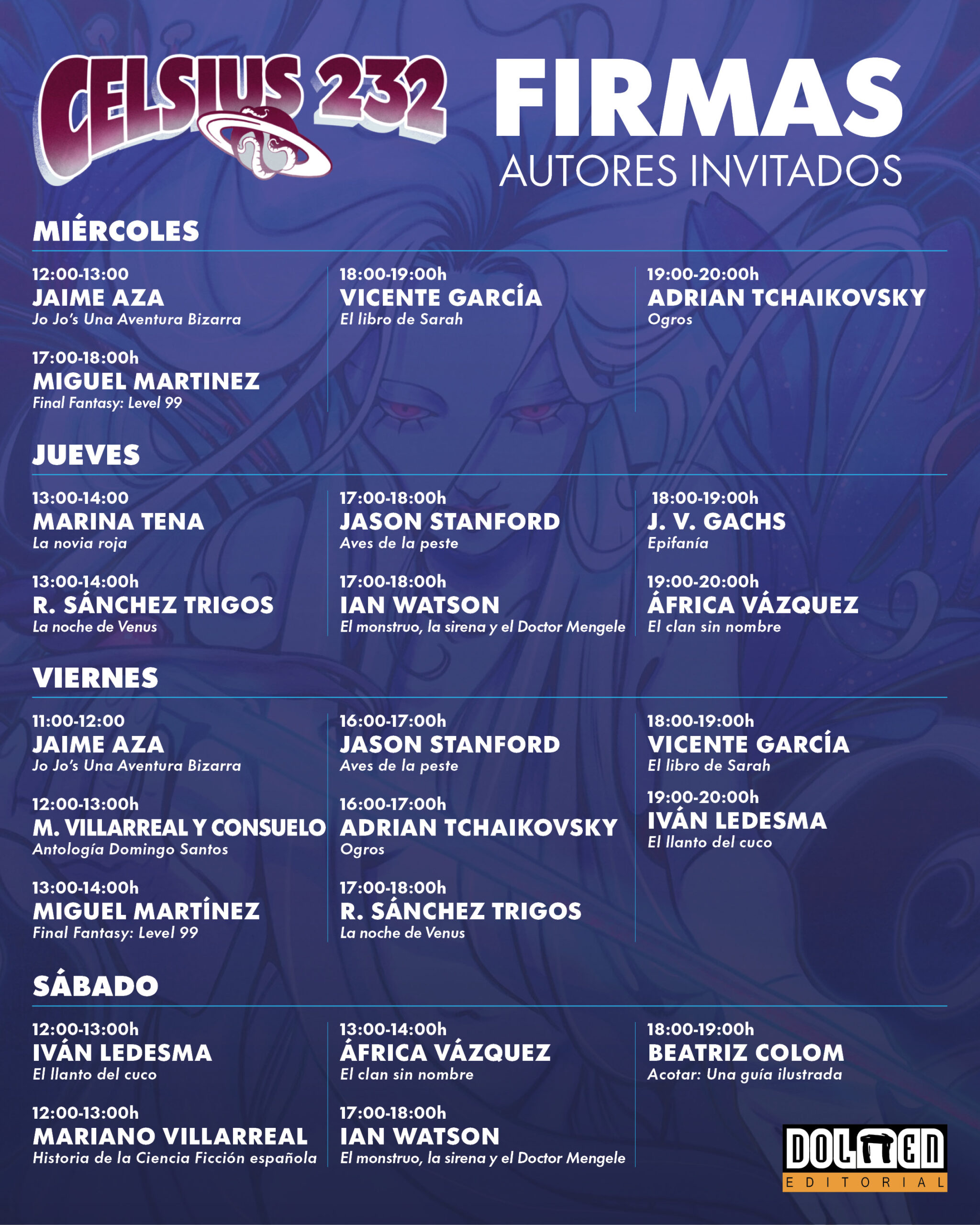 Este año volvemos con una programación repleta de grandes nombres del panorama literario nacional e internacional. Si te apasionan la fantasía, la ciencia ficción, o el terror, no puedes perderte las sesiones de firmas en nuestro stand.