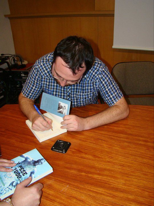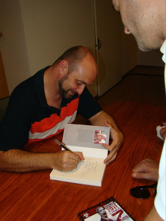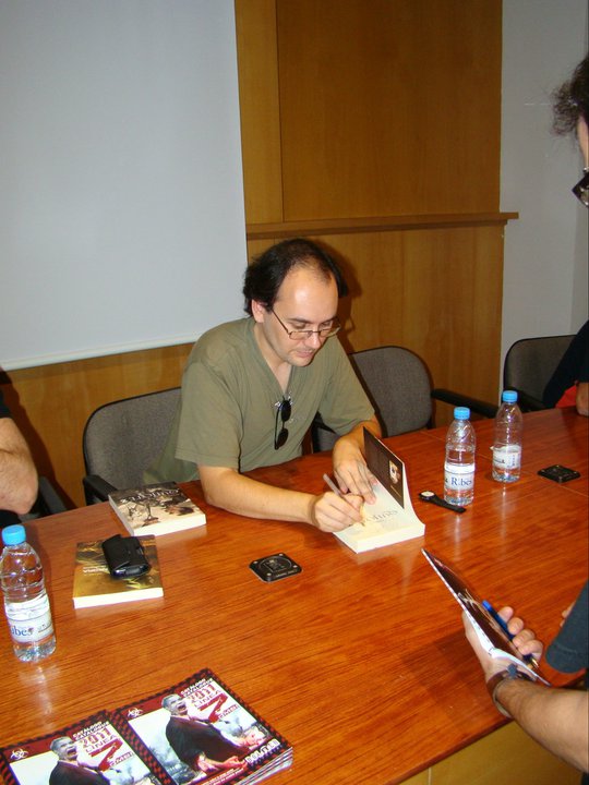 Total, las doce. Entramos de nuevo a la librería y para nuestra sorpresa la gente seguía allí. La verdad es que estábamos como flanes. Poco a poco nos fuimos acercando a la mesa, tímidos, cabizbajos… somos gente rara. Segundos después la gente se abalanzó sobre nosotros, querían nuestras firmas, nuestra ropa, nuestro ser, aquello se convirtió en una vorágine orgiástica de cuidado… bueno, en realidad comenzamos a firmar libros. Durante una hora intensa no paramos, Carlos sobre todo, qué manera de vender libros, por Dios. Eso sí, sufrió mi envidia porque le dejábamos fuera de las fotos. En serio, este hombre mueve masas, queríamos pegarles. Pero para qué quejarnos, Házael, Sergi y yo tampoco paramos mucho y conocimos a gente maravillosa. No firmé ningún pecho, pero no me hizo falta para ser feliz.