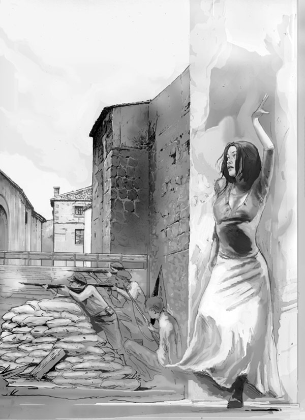 Efectivamente, Martillo de Herejes nos cuenta de forma fría y sin muchas contemplaciones lo que sucede en un pequeño pueblo español cuando la contienda llama a sus puertas de forma inesperada, y varios camiones repletos de republicanos llegan inesperadamente para todos (incluso para los que llegan) hasta la plaza del pueblo, donde los nacionales estaban haciendo acopio de provisiones. Se desatarán entonces algunos escarceos que harán que los recién llegados tengan que refugiarse en el monasterio del pueblo, situado en lo alto de una colina. Es entonces cuando comienzan a surgir los problemas internos dentro de las filas republicanas, fruto de la desconfianza que había dentro de sus distintos miembros (anarquistas, comunistas, republicanos, brigadistas…). Además, por si fuera poco, uno de los protagonistas de la historia, el idealista y miembro de la CNT, se enamora de la hija del alcalde del pueblo, una mujer atractiva e interesante con la que debatirá sobre los principios de “la revolución”. Consideré –nos decía a este respecto Juan Gómez, guionista del álbum- que era una buena oportunidad para reflejar las diferencias sociales existentes, y como a pesar de ello podía surgir algo entre los personajes. Y es que las pequeñas dosis de filosofía sin ningún tipo de moralina con segundas apenas se notan gracias a la manera en que están introducidas en el cómic.