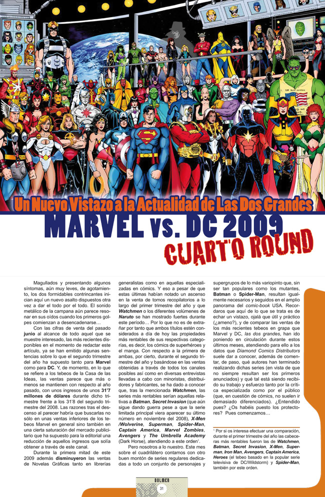 Este mes, en la cuarta parte del artículo Marvel vs DC se analiza a fondo las series de los Vengadores, así como otras como Agents of Atlas, Secret Warriors, Thunderbolts, The Brave and the Bold, Green Arrow and Black Canary, Runaways, Squadron Supreme, Daredevil, las diversas colecciones del Castigador, Ghost Rider, Caballero Luna, etc.