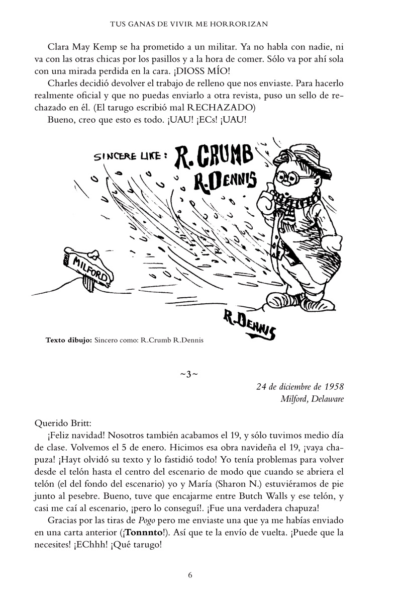 Por una vez, y contra lo acostumbrado en esta sección, hablaré de un libro que no es un cómic. O no del todo. Robert Crumb justifica esta excepción y casi cualquier otra. Tus ganas de vivir me horrorizan. Correspondencia (1958-1977) (Dolmen) reúne cincuenta cartas suyas. Las escribió casi todas desde la casa familiar y luego desde Cleveland, adonde fue a buscarse la vida como dibujante, entre sus 16 y 21 años, de 1958 a 1964; sólo las últimas siete están datadas a partir de 1968, cuando marchó a San Francisco para vivir el verano del amor. Las escribió a dos amigos: Mike Britt, que había sido compañero de clase, y Marty Pahls, a quien conoció por carta y a causa de un fanzine que Crumb publicó con su hermano Charles. Le unía a ambos una afición compartida: los cómics, a los que se añadiría al poco la música.