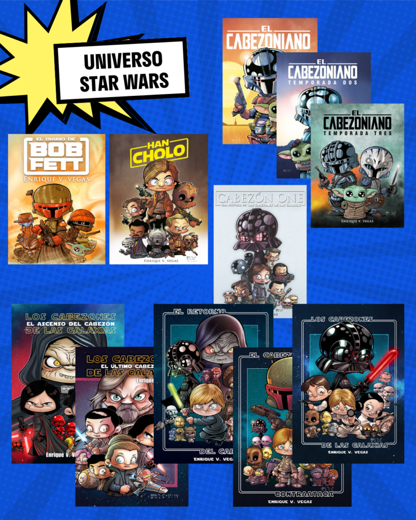 De su ingenio han nacido títulos tan desternillantes como Los Cabezones de la Galaxia, Cabezones del Caribe, El Cabezón de los Anillos o Cabezón Jones, donde revisita clásicos del cine de aventuras, fantasía o ciencia ficción desde una perspectiva única. Pero su universo no se queda ahí: también ha jugado con superhéroes (Espiderman), magos (Jarripoter) e incluso con historias originales como Leinad o Kobe.